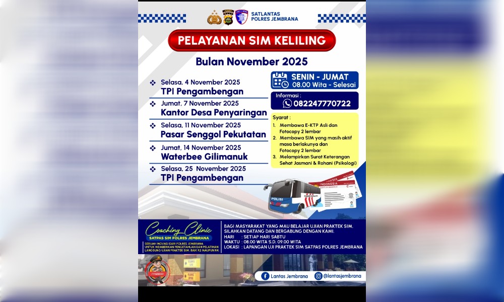 Satlantas Polres Jembrana telah menetapkan lima titik lokasi layanan SIM keliling yang berlangsung pada Bulan November 2025. Warga yang ingin memperpanjang SIM dapat mendatangi lokasi, berikut jadwalnya: