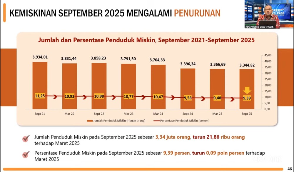 M-RADARNEWS.COM, JATENG – Badan Pusat Statistik (BPS) Provinsi Jawa Tengah (Jateng) mencatat penurunan jumlah penduduk miskin pada September 2025 menjadi 3,34 juta orang atau 9,39 persen. Angka tersebut membaik dibanding Maret 2025, yang tercatat 9,48 persen.