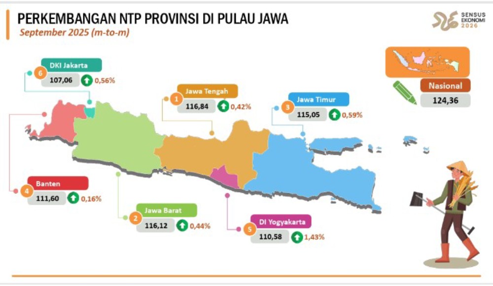 “Alhamdulillah, NTP Jawa Tengah bulan September 2025 ini merupakan NTP yang tertinggi di Pulau Jawa,” kata Statistisi Ahli Utama sekaligus Kepala Badan Pusat Statistik (BPS) Provinsi Jawa Tengah, Endang Tri Wahyuningsih dalam rilis BPS, Rabu (01/10/2025).