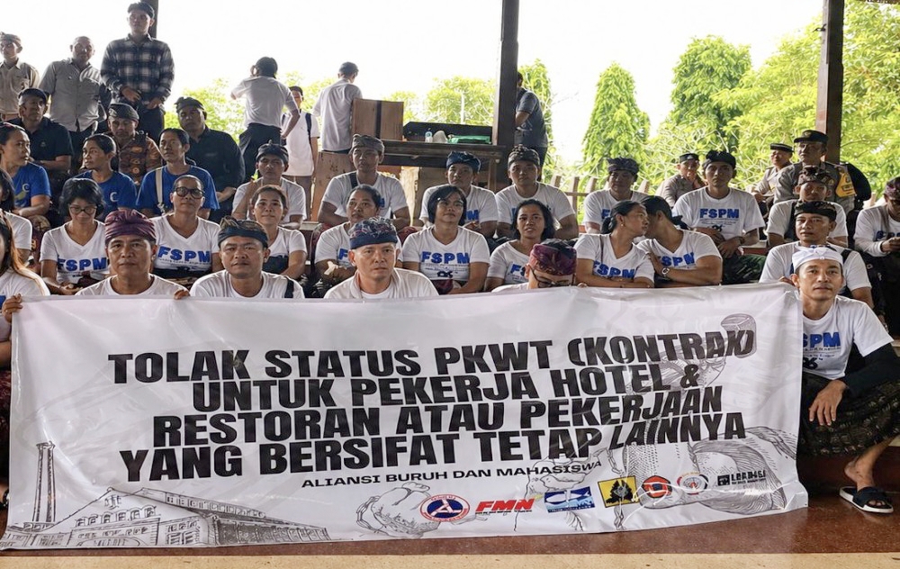 “Di balik pariwisata Bali yang indah dan premium, ada persoalan eksploitasi melalui sistem kontrak, pekerja harian, magang, dan outsourcing,” kata Rai.