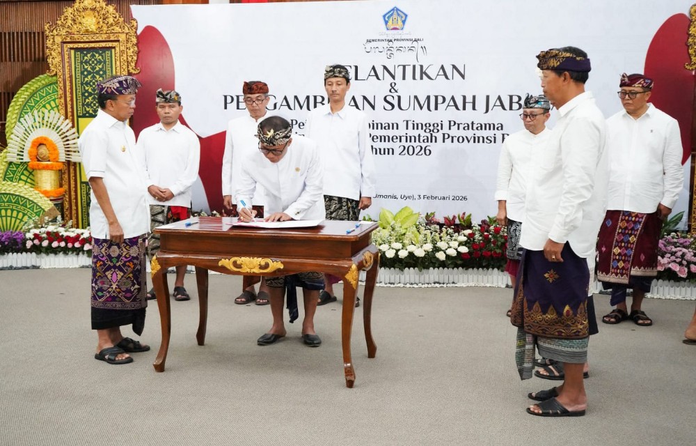 M-RADARNEWS.COM, BALI – Gubernur Bali, I Wayan Koster melantik enam Pejabat Pimpinan Tinggi (JPT) Pratama di lingkungan Pemerintah Provinsi (Pemprov) Bali, di Gedung Wiswa Sabha Utama, Kantor Gubernur Bali, Selasa (03/02/2025). Pelantikan tersebut berdasarkan Keputusan Gubernur Bali Nomor 175/04-C/HK/2026.
