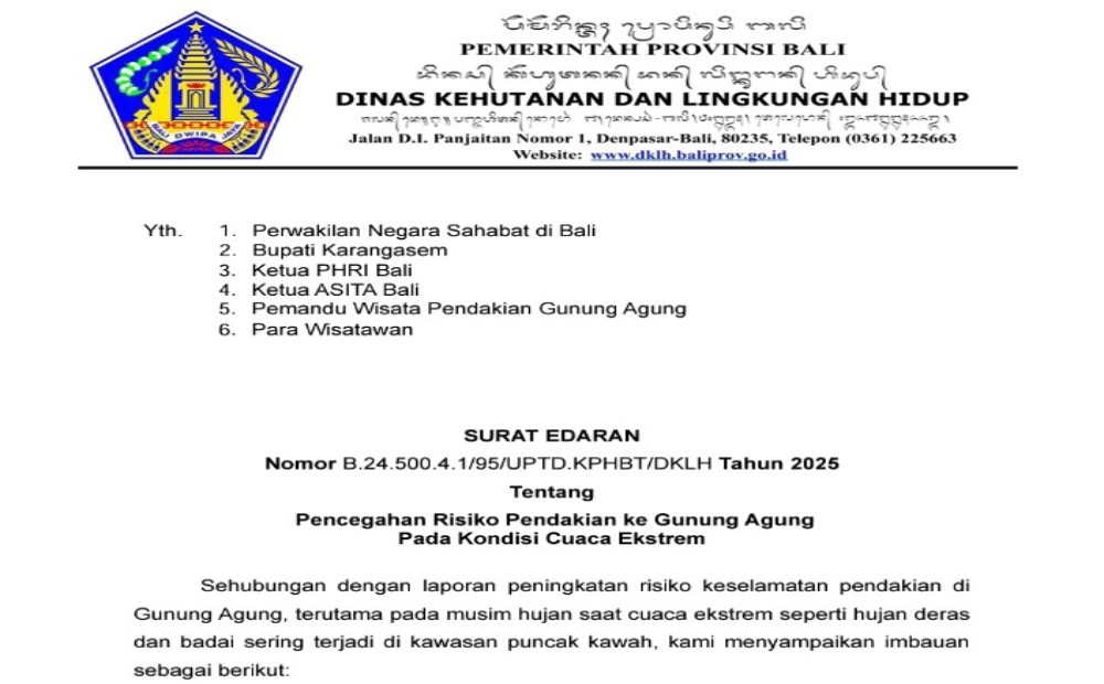Imbauan ini dituangkan dalam Surat Edaran (SE) Plt. Kepala Dinas Kehutanan dan Lingkungan Hidup Provinsi Bali Nomor B.24.500.4.1/95/UPTD.KPHBT/DKLH Tahun 2025 tentang Pencegahan Risiko Pendakian ke Gunung Agung Pada Kondisi Cuaca Ekstrem, yang dikeluarkan di Denpasar, Jumat (10/01/2025).