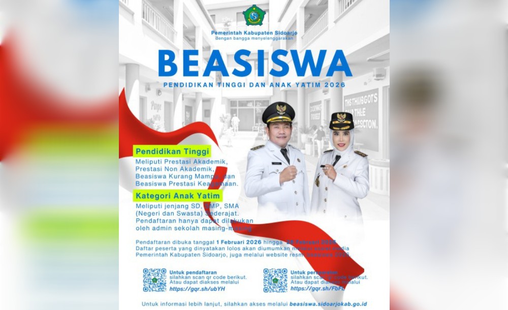 Pendaftaran Program Beasiswa 2026, berlangsung 1-28 Februari 2026, dan dilakukan secara online melalui situs resmi beasiswasidoarjokab.go.id. Masyarakat diimbau segera melengkapi persyaratan sesuai ketentuan yang berlaku.