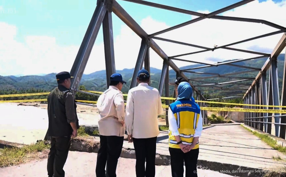 Tiba di lokasi, Presiden langsung menuju titik kerusakan untuk melihat kondisi jembatan dari jarak dekat. Sisa rangka baja terlihat menggantung dan tergerus arus sungai yang masih deras.