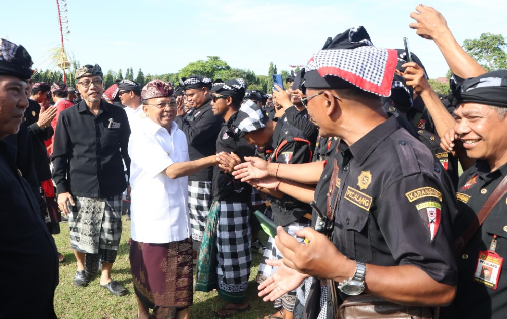 Usai memimpin upacara, Gubenur asal Desa Sembiran, Tejakula, Buleleng itu melakukan inspeksi pasukan pecalang yang hadir dari seluruh desa adat se-Bali.