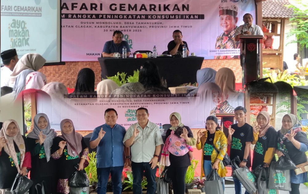 M-RADARNEWS.COM, JATIM – Anggota Komisi IV DPR RI Sonny T Danaparamita menggelar Safari Gerakan Memasyarakatkan Makan Ikan (Gemarikan) di Dusun Mondoluko, Desa Tamansuruh, Kecamatan Glagah, Banyuwangi, Minggu (30/11/2025). Kegiatan ini digelar untuk mendorong peningkatan konsumsi ikan sebagai salah satu langkah pencegahan stunting.