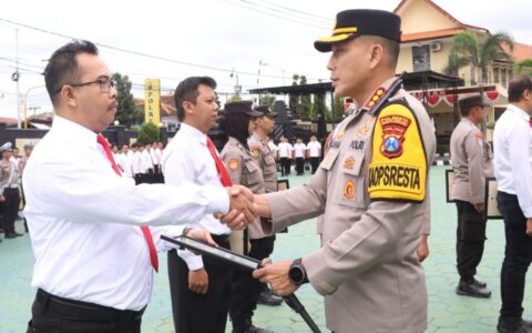 M-RADARNEWS.COM, JATIM – Kepala Kepolisian Resor Kota (Kapolresta) Banyuwangi Kombes Pol Rama Samtama Putra, S.I.K., M.Si., M.H., memberikan penghargaan kepada 43 personel Polresta Banyuwangi beserta Polsek jajaran yang berprestasi di berbagai bidang yang berlangsung di Lapangan Apel Polresta Banyuwangi, Senin (08/09/2025).